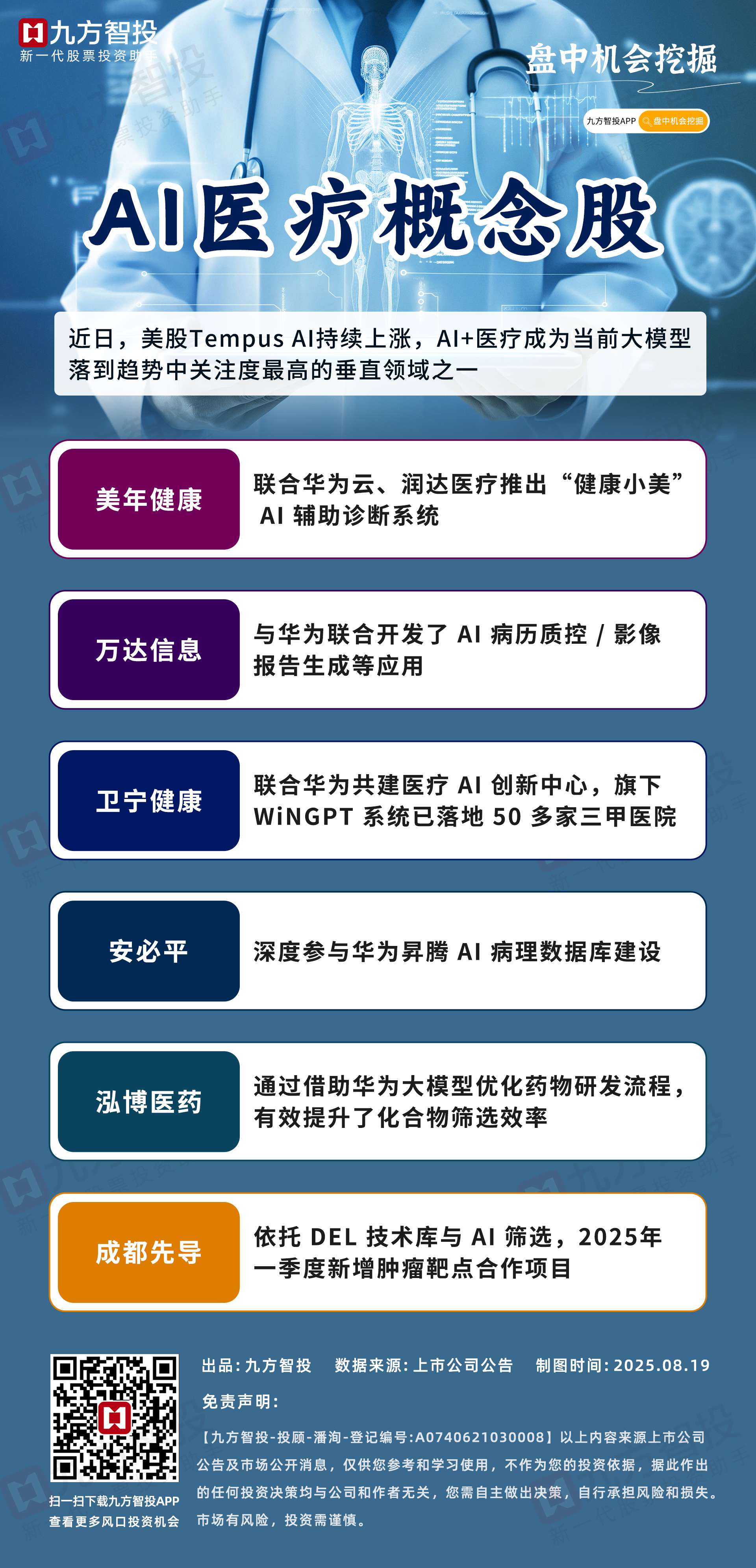 今日题材挖掘:近日,美股Tempus AI持续上涨,AI+医疗成为当前大模型落到趋势中关注度最高的垂直领域之一(AI医疗概念股);