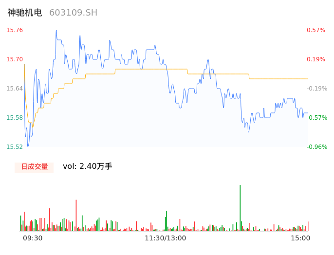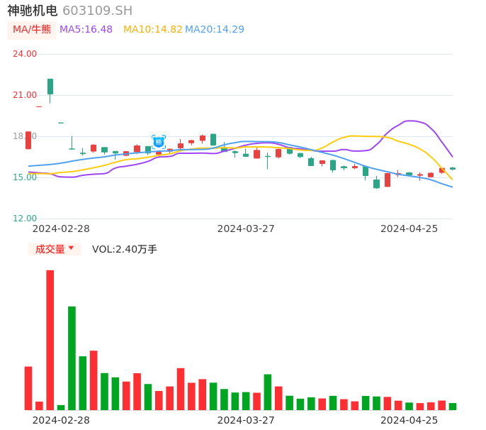 04月25日,神驰机电收报15.60,股价涨幅-0.45%,成交金额3751.88万元,换手率1.15%。