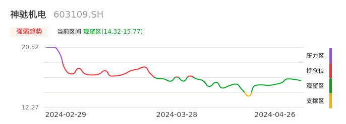 我们来看一下该股的九方特色指标强弱趋势的情况:神驰机电自04月17日从支撑区回到观望区。股价经过前期快速下跌后中途弱势整理。现在下跌动能有重新放大迹象,弱势反弹行情可能临近尾声。建议继续谨慎观望。