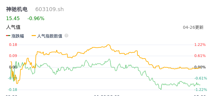 04月26日,神驰机电收报15.45,股价涨幅-0.96%,成交金额6654.50万元,换手率2.06%。
