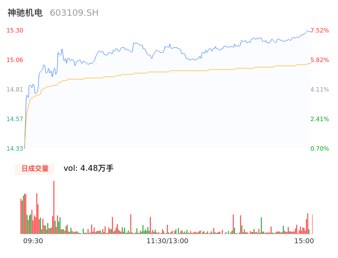 04月17日,神驰机电收报15.29,股价涨幅7.45%,成交金额6735.90万元,换手率2.15%。