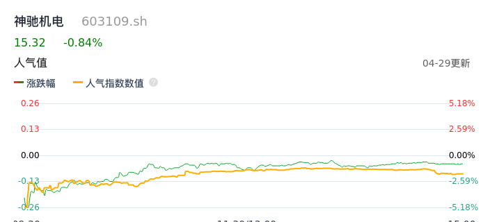 04月29日,神驰机电收报15.32,股价涨幅-0.84%,成交金额8365.40万元,换手率2.67%。