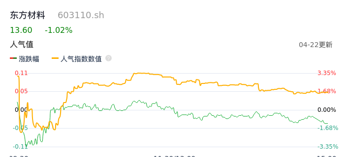 04月22日,东方材料收报13.60,股价涨幅-1.02%,成交金额5516.04万元,换手率2.01%。