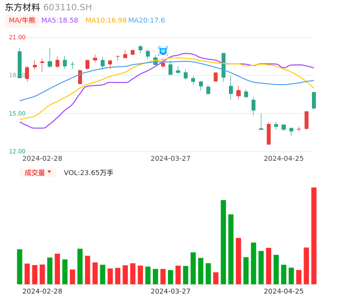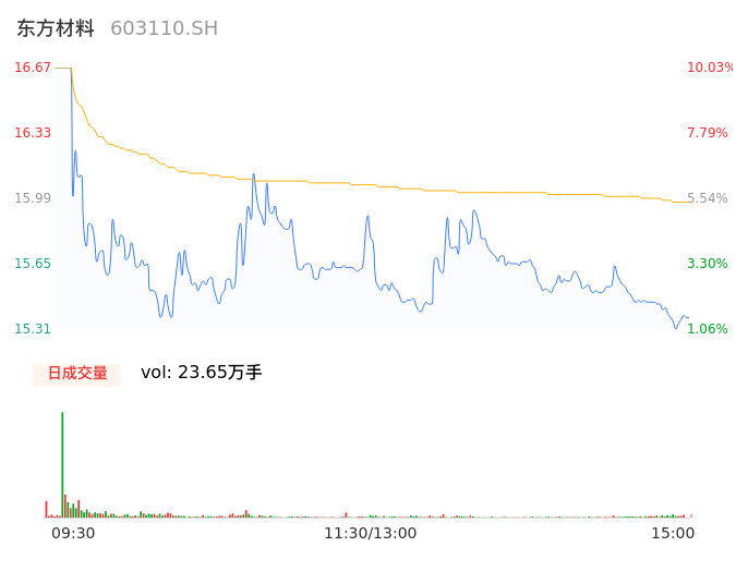 04月25日,东方材料收报15.41,股价涨幅1.72%,成交金额3.77亿元,换手率11.75%。