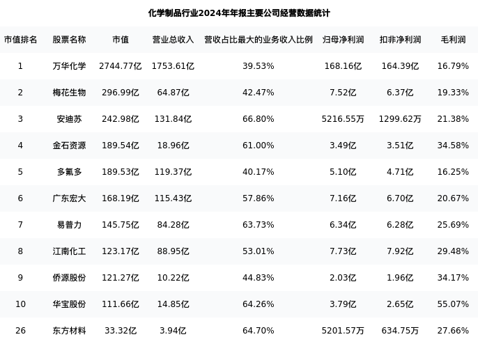 东方材料最新报告期数据为年报,下表汇总了化学制品行业内市值靠前的公司年报主要经营数据