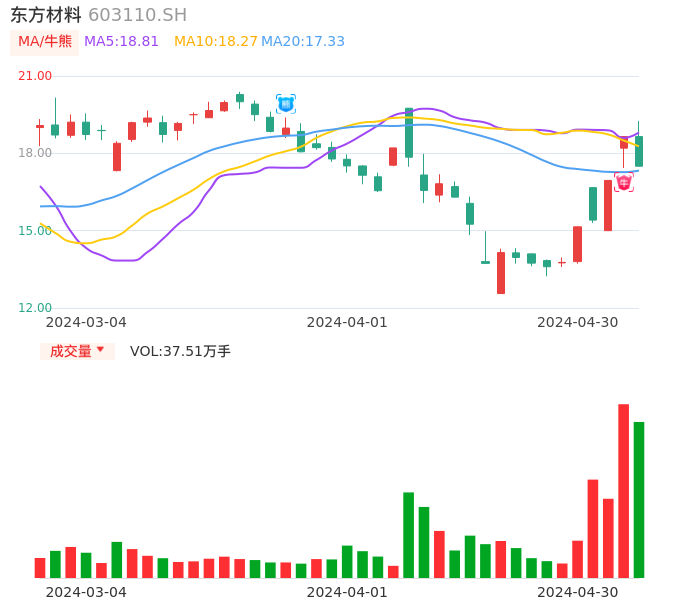 04月30日,东方材料收报17.50,股价涨幅-6.17%,成交金额6.87亿元,换手率18.64%。
