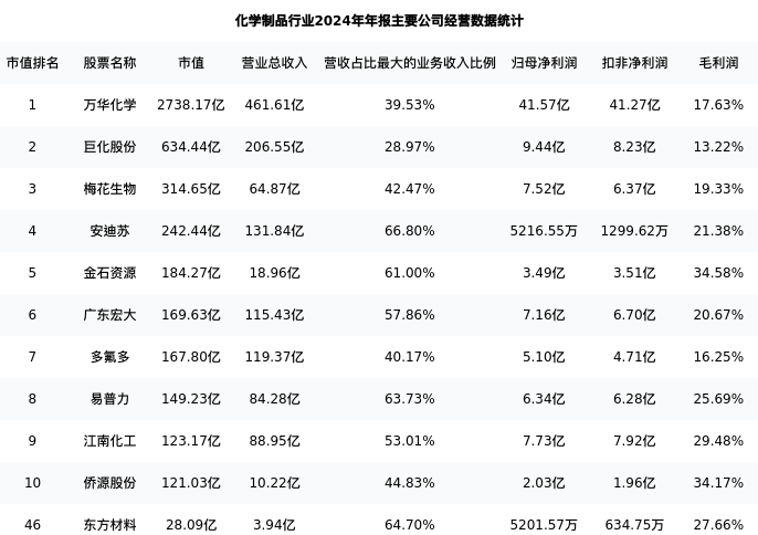 东方材料最新报告期数据为年报,下表汇总了化学制品行业内市值靠前的公司年报主要经营数据