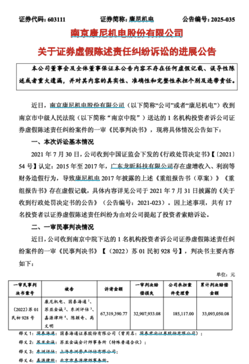 7月29日晚,康尼机电披露了证券虚假陈述责任纠纷诉讼的最新进展。公司近日收到南京中院下达1名机构投资者提起的诉讼作出的一审《民事判决书》,公司被判决负担赔偿损失及案件受理费合计金额为3309.31万元。