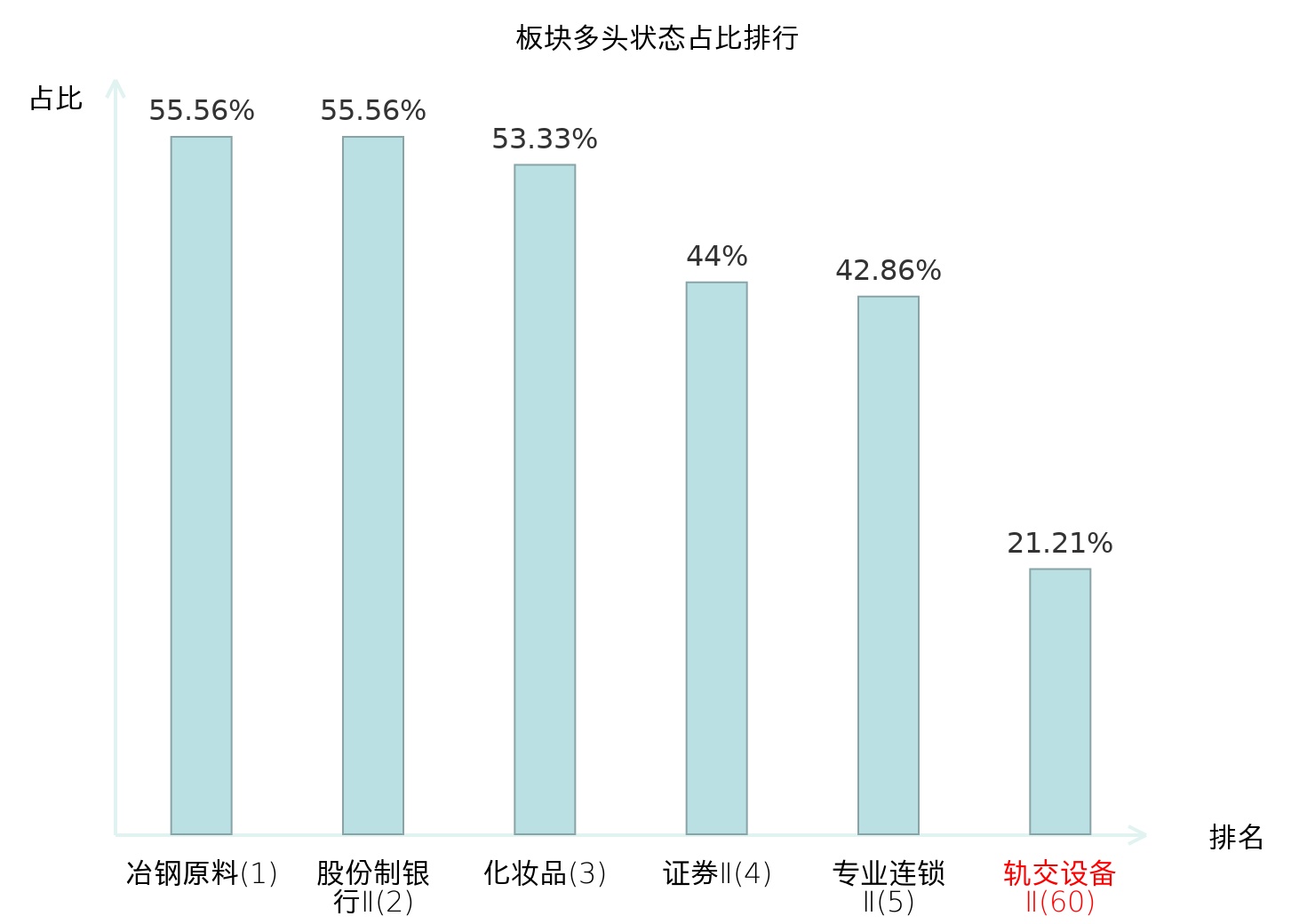 全市场所有行业板块中主力多头状态占比排名中,冶钢原料板块位居第一。保险Ⅱ板块名次提升最快,较昨日上升114位。