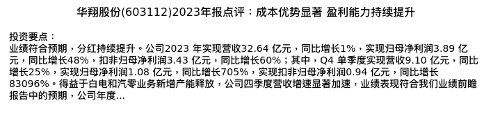 值得注意的是:2024年04月上海申银万国证券研究所的刘正/刘嘉玲分析师,首次发布关于华翔股份的研究报告,标题为:华翔股份(603112)2023年报点评:成本优势显著 盈利能力持续提升。