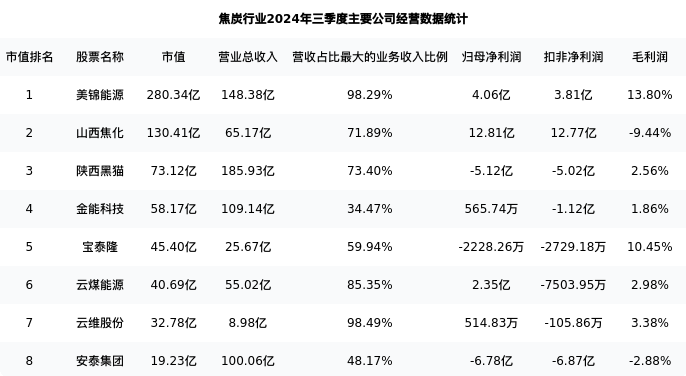 金能科技最新报告期数据为三季度,下表汇总了焦炭行业内市值靠前的公司三季度主要经营数据