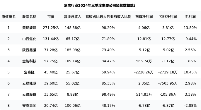 金能科技最新报告期数据为三季度,下表汇总了焦炭行业内市值靠前的公司三季度主要经营数据