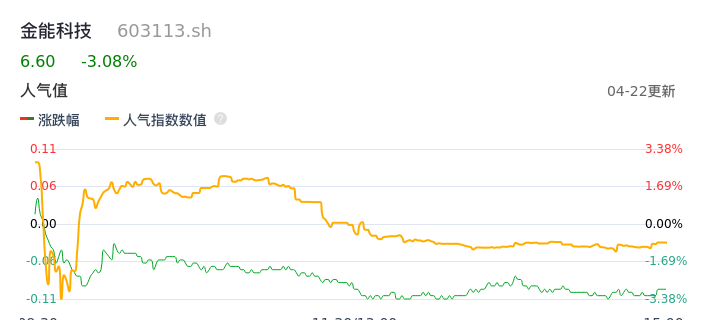 04月22日,金能科技收报6.60,股价涨幅-3.08%,成交金额6392.38万元,换手率1.13%。
