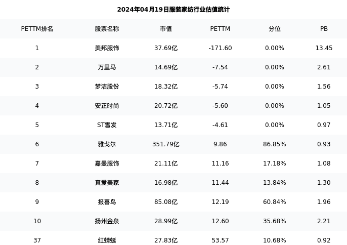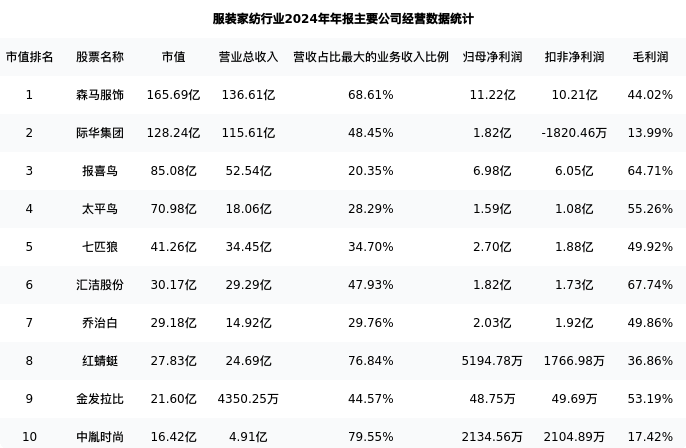 红蜻蜓最新报告期数据为年报,下表汇总了服装家纺行业内市值靠前的公司年报主要经营数据