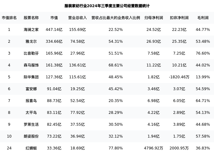 红蜻蜓最新报告期数据为三季度,下表汇总了服装家纺行业内市值靠前的公司三季度主要经营数据