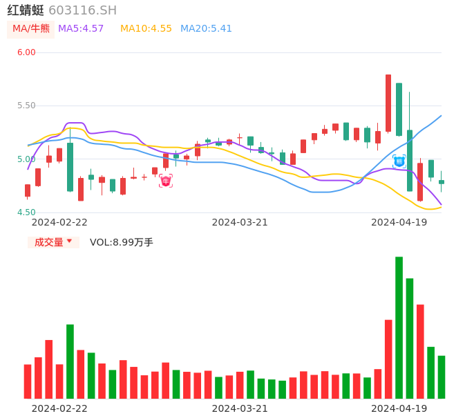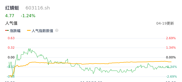 04月19日,红蜻蜓收报4.77,股价涨幅-1.24%,成交金额4300.68万元,换手率1.56%。