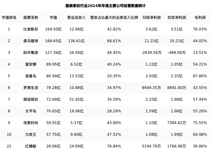 红蜻蜓最新报告期数据为年报,下表汇总了服装家纺行业内市值靠前的公司年报主要经营数据