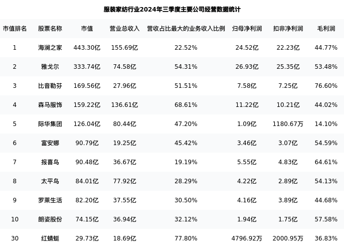 红蜻蜓最新报告期数据为三季度,下表汇总了服装家纺行业内市值靠前的公司三季度主要经营数据