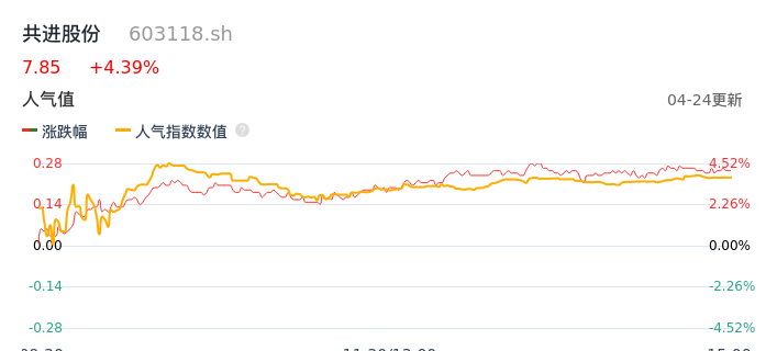 04月24日,共进股份收报7.85,股价涨幅4.39%,成交金额9681.40万元,换手率1.59%。