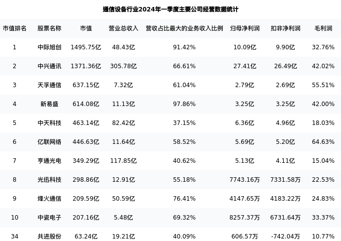 共进股份最新报告期数据为一季度,下表汇总了通信设备行业内市值靠前的公司一季度主要经营数据