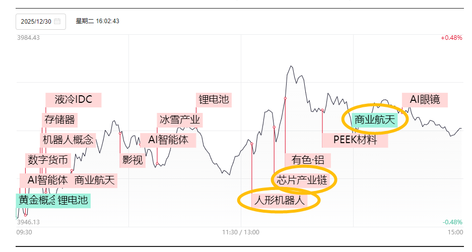 个股表现上,最终指数涨上来了,但是个股反而下跌多了起来,超3400股下跌,涨停66只,跌停19只,个股中位数微跌0.5%左右。赚钱效应今天整体较差,局部强劲。量能上下午出现回补量能的走势,最终日内还小幅放量不足百亿,放量一个是商业航天跳水的影响,二是机器人、芯片算力等硬科技板块的活跃带动。成交量连续3个交易日维持在2.2万亿附近,只要不大幅缩量或者放量,市场并不会有太大的风险,仍然会有局部机会走出。