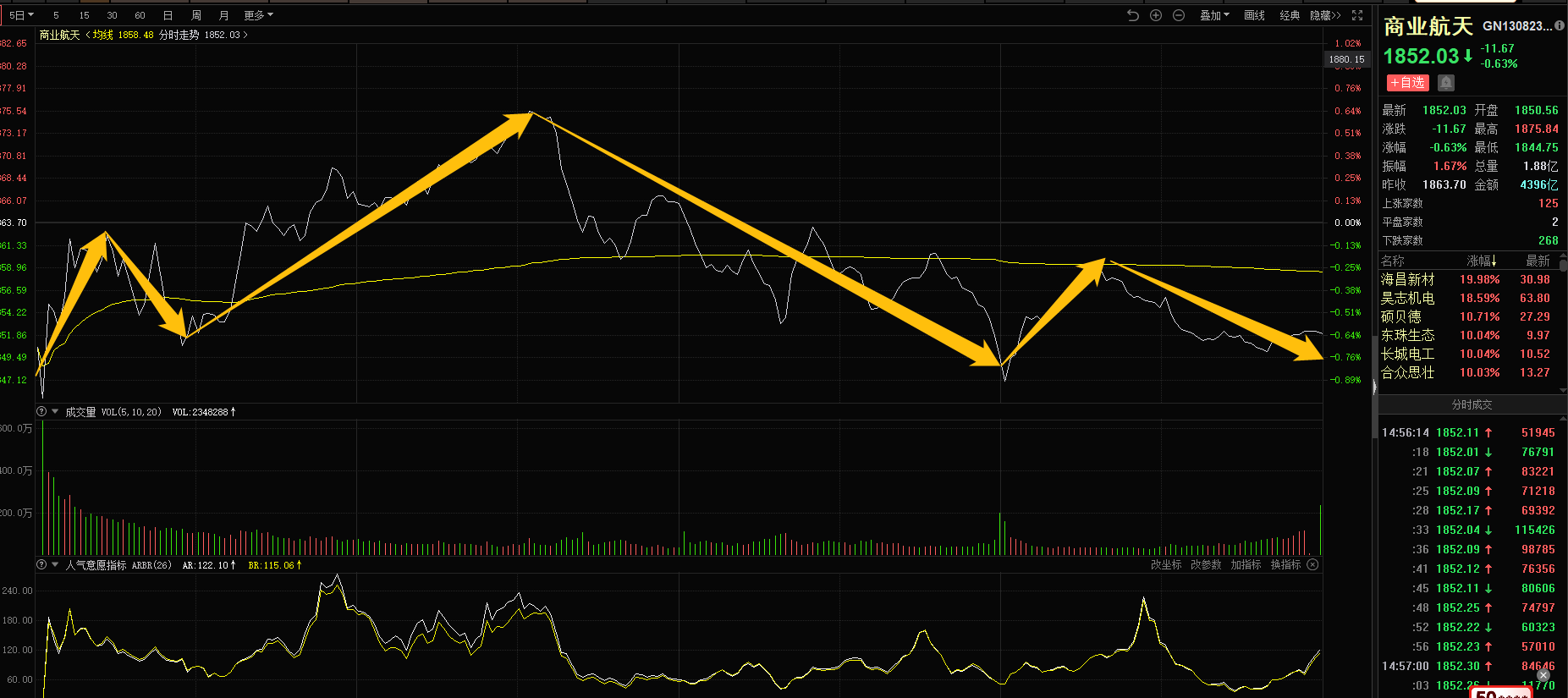 机器人的强势,是商业航天跳水砸出的筹码贡献的,这几天高位股陆续的掉队,通宇通讯再升科技走弱后,今天神剑股份、航天发展掉队,下午航天发展也出现跌破分时均价线一步步走低的走势,日内成交200多个亿,总市值才400多亿,几乎占了一半的筹码换手了,这个位置高位巨量换手的阴量柱,还是挺吓人的,也是商业航天下午指数不断走弱的原因,加上中国卫星今天也是大幅的冲高回落,高位股一旦获利了结起来杀跌也是很明显的,所以短期商业航天要注意这里出现一波整体的亏钱效应行情,注意回避,下跌初期可能还能侥幸获利,但是一旦机构高位开始砸就可能就难逃一劫了。