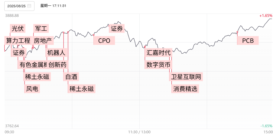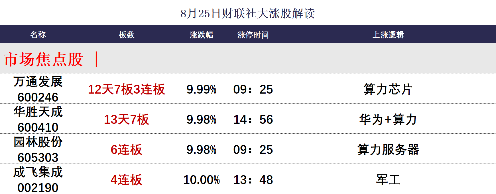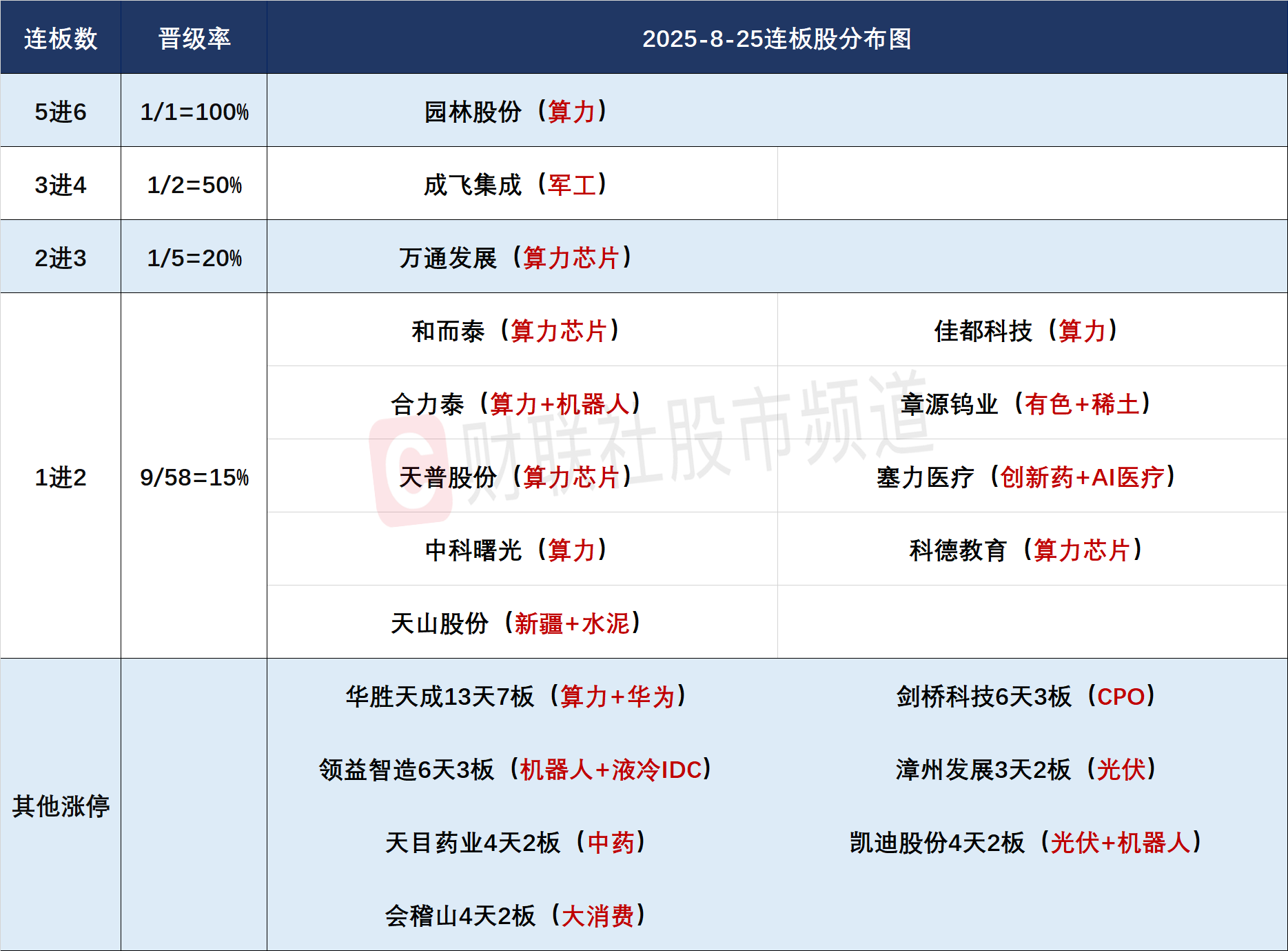 财联社8月25日讯,今日77股涨停,40股炸板,封板率为66%,园林股份6连板,成飞集成4连板,万通发展12天7板,华胜天成13天7板,合力泰4天3板,领益智造、剑桥科技6天3板,北交所中航泰达30cm首板。市场全天震荡走高,沪指逼近3900点,创业板指领涨。沪深两市全天成交额3.14万亿,较上个交易日放量5944亿,为历史第二高成交额。盘面上,市场热点快速轮动,个股涨多跌少,全市场超3300只个股上涨。板块方面,稀土永磁、白酒、CPO、通信设备等板块涨幅居前,美容护理等少数板块下跌。截至收盘,沪指涨1.51%,深成指涨2.26%,创业板指涨3%。