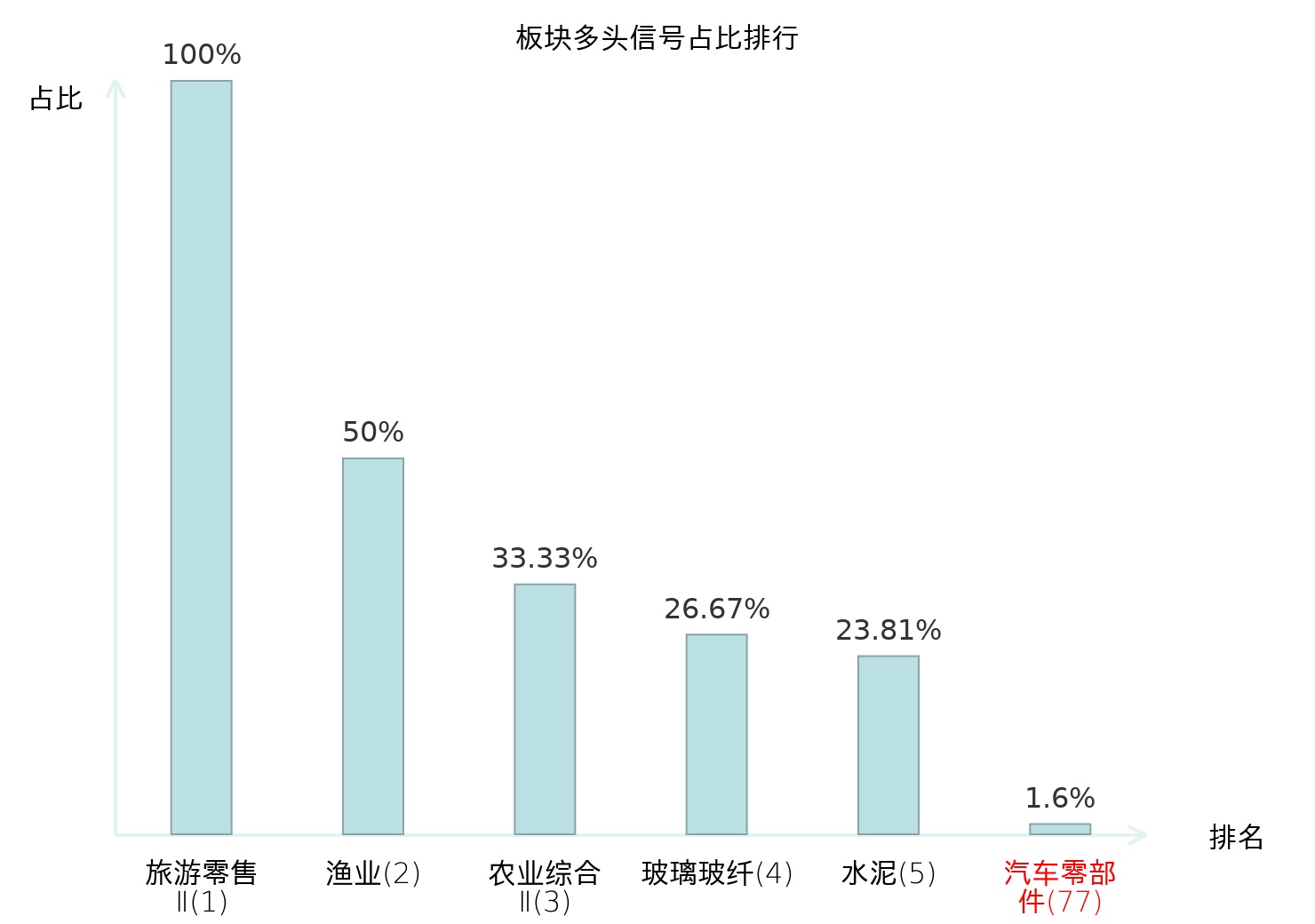 全市场所有行业板块中主力多头信号占比排名中,旅游零售Ⅱ板块位居第一。旅游零售Ⅱ板块名次提升最快,较昨日上升130位。