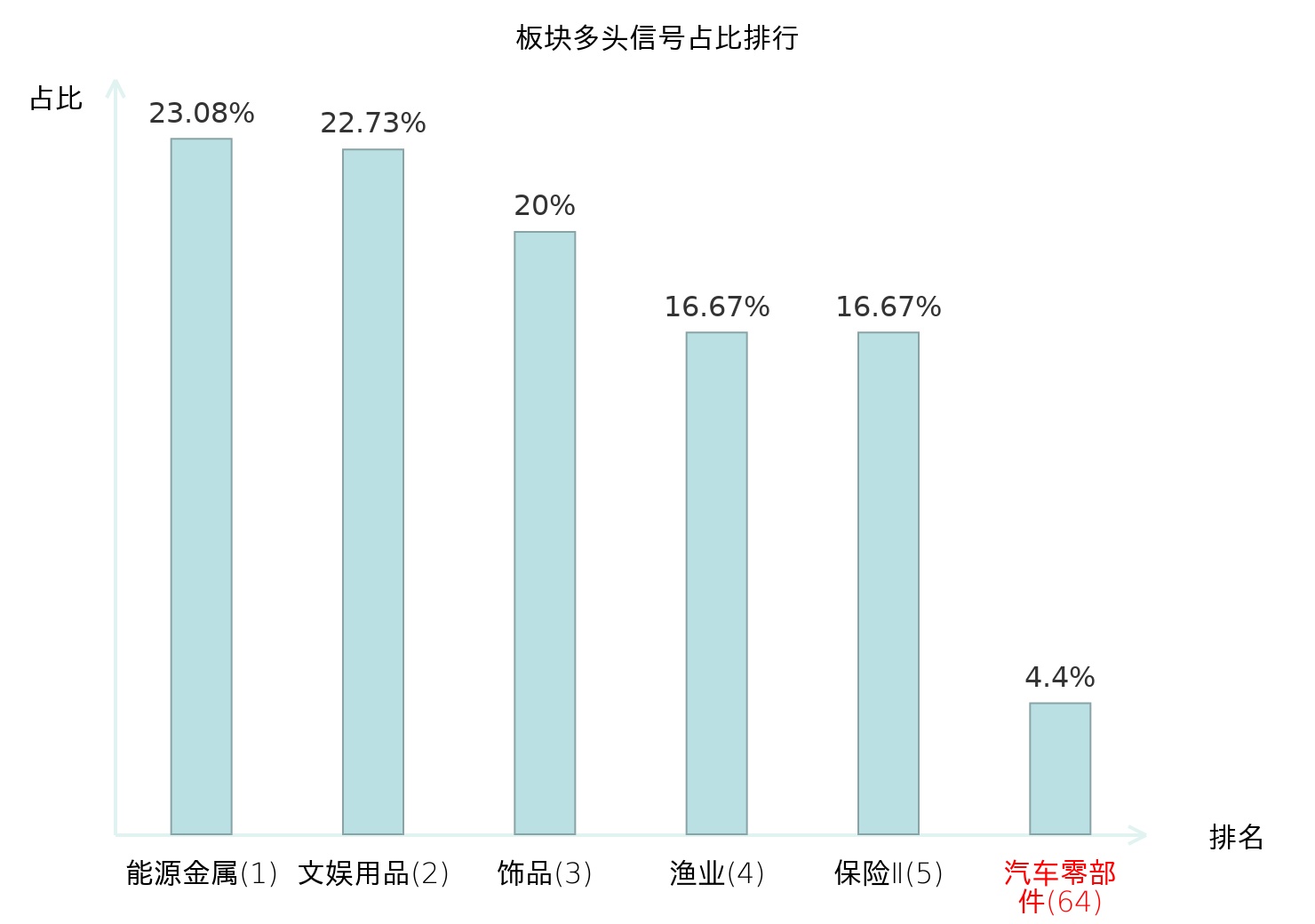 全市场所有行业板块中主力多头信号占比排名中,能源金属板块位居第一。保险Ⅱ板块名次提升最快,较昨日上升120位。