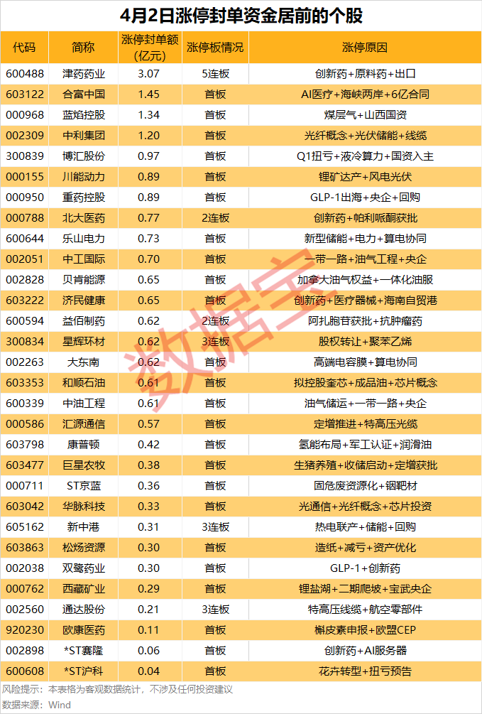 以封单金额计算,津药药业、合富中国、蓝焰控股涨停板封单资金居前,分别有3.07亿元、1.45亿元、1.34亿元。