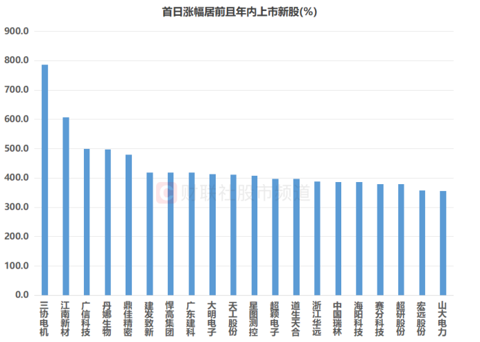 从首日表现上看,累计共有81股年内首日涨幅翻倍,占整个市场近88%,高于去年比例(71%)。其中,自北交所的三协电机录得785.62%的涨幅,位居年内首日涨幅榜首,江南新材、广信科技、丹娜生物、鼎佳精密、建发致新等股首日也涨幅明显。不过,也有部分新股首日表现一般,其中,中策橡胶首日涨幅唯一不足10%。