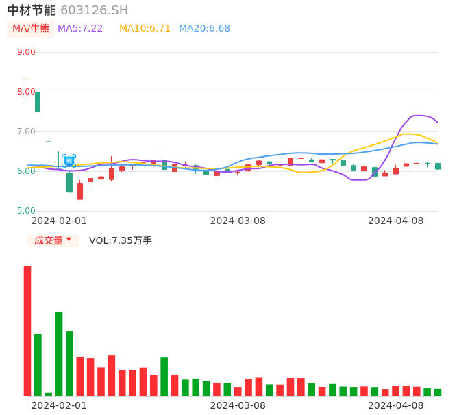 04月08日,中材节能收报6.05,股价涨幅-2.26%,成交金额4490.24万元,换手率1.20%。