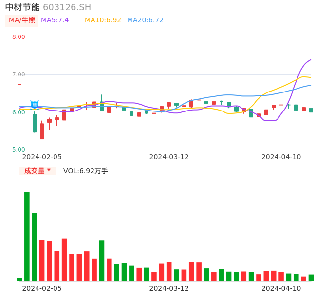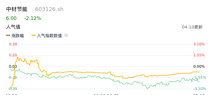 04月10日,中材节能收报6.00,股价涨幅-2.12%,成交金额4170.27万元,换手率1.13%。