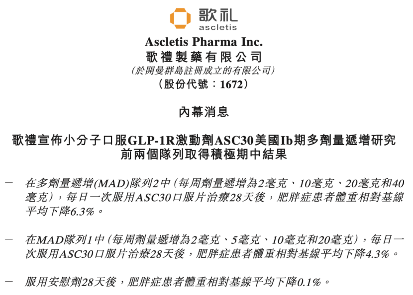 2月19日,歌礼制药在港交所发布公告,宣布其小分子口服GLP-1R激动剂ASC30在美国的Ib期多剂量递增研究取得积极期中结果。