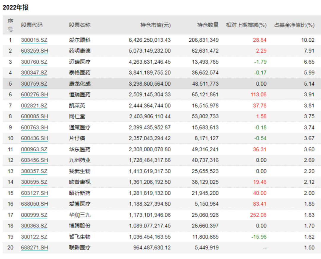 年报显示,该基金第11名至第20名隐形重仓股,主要有华东医药、九洲药业、我武生物、欧普康视、昭衍新药、爱博医疗、华润三九、博腾股份、智飞生物、联影医疗。