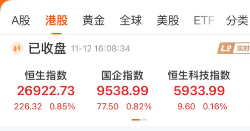 上证报中国证券网讯11月12日,港股三大指数走强。截至收盘,恒生指数涨0.85%,报26922.73点;恒生科技指数涨0.16%,报5933.99点;国企指数涨0.82%,报9538.99点。