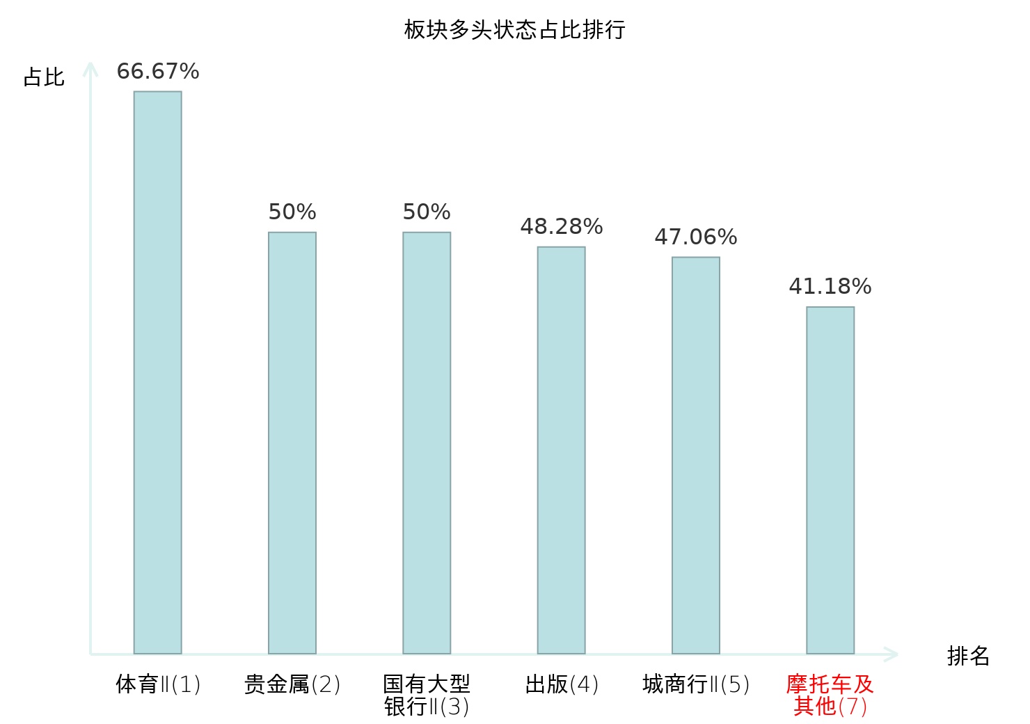 全市场所有行业板块中主力多头状态占比排名中,体育Ⅱ板块位居第一。电子化学品Ⅱ板块名次提升最快,较昨日上升78位。