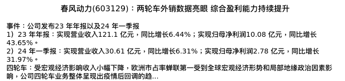 值得注意的是:2024年04月招商证券的董瑞斌/郑晓刚分析师,首次发布关于春风动力的研究报告,标题为:春风动力(603129):两轮车外销数据亮眼 综合盈利能力持续提升。