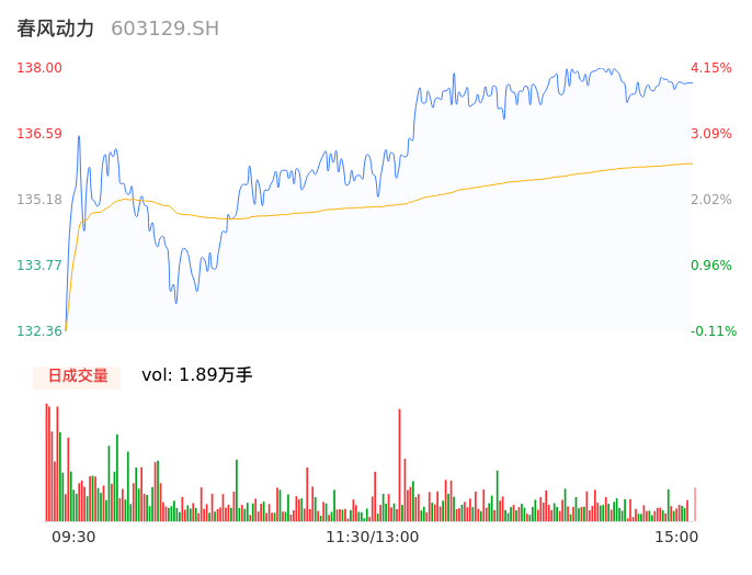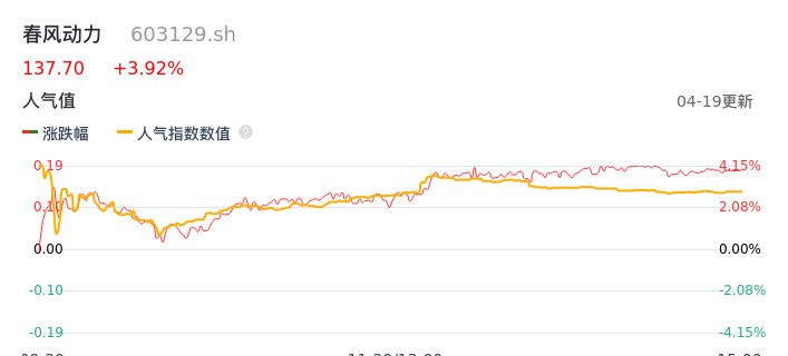 04月19日,春风动力收报137.70,股价涨幅3.92%,成交金额2.56亿元,换手率1.25%。
