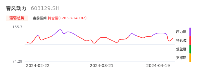 我们来看一下该股的九方特色指标强弱趋势的情况:春风动力近日从压力区回到持仓区。股价快速拉升后出现持续调整,目前出现启稳回暖态势。后续重点关注上方压力位:140.82元是否能再次上攻。