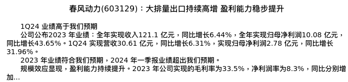 值得注意的是:2024年04月中金公司的分析师,首次发布关于春风动力的研究报告,标题为:春风动力(603129):大排量出口持续高增 盈利能力稳步提升。