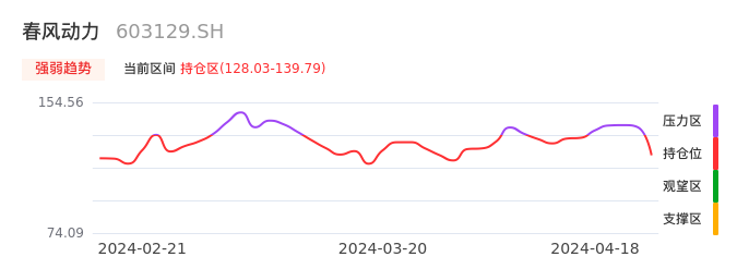 我们来看一下该股的九方特色指标强弱趋势的情况:春风动力近日从压力区回到持仓区。股价快速拉升后出现持续调整。后续主要关注下方支撑位:128.03元是否能启稳回升。