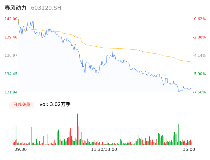 04月18日,春风动力收报132.50,股价涨幅-7.27%,成交金额4.13亿元,换手率2.02%。