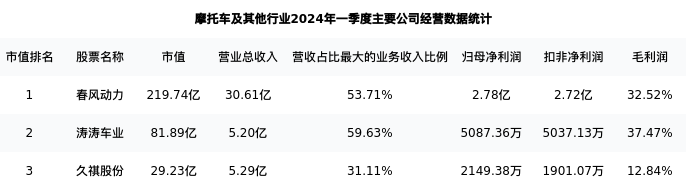 春风动力最新报告期数据为一季度,下表汇总了摩托车及其他行业内市值靠前的公司一季度主要经营数据