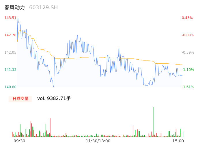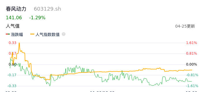 04月25日,春风动力收报141.06,股价涨幅-1.29%,成交金额1.33亿元,换手率0.62%。