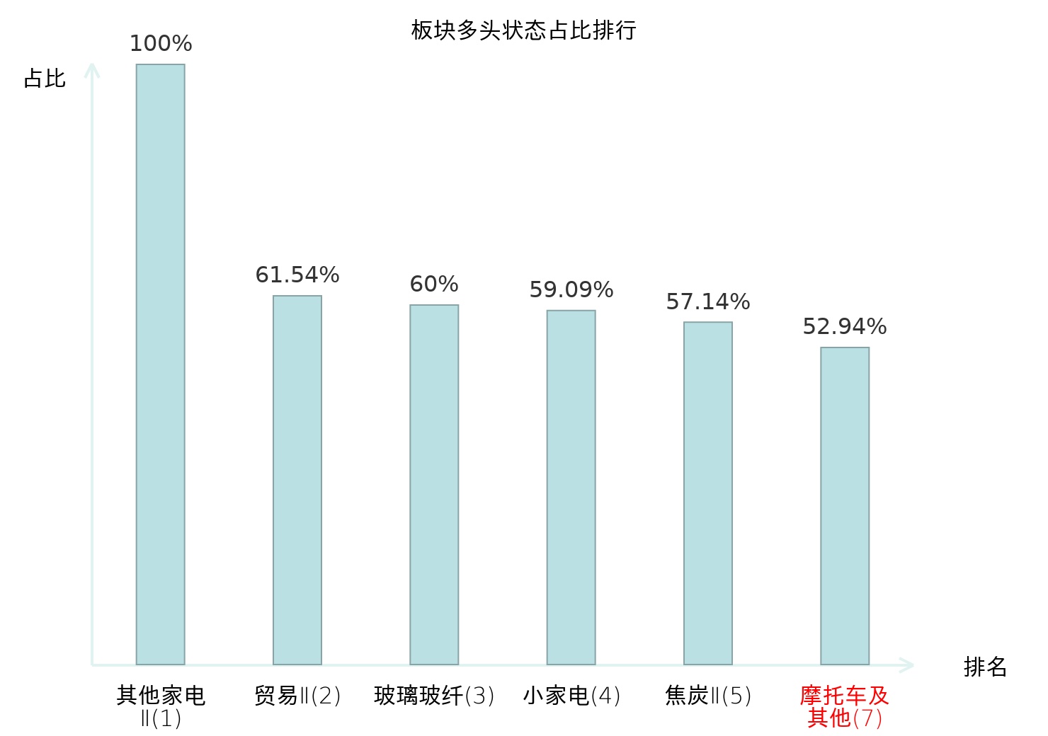 全市场所有行业板块中主力多头状态占比排名中,其他家电Ⅱ板块位居第一。摩托车及其他板块名次提升最快,较昨日上升76位。