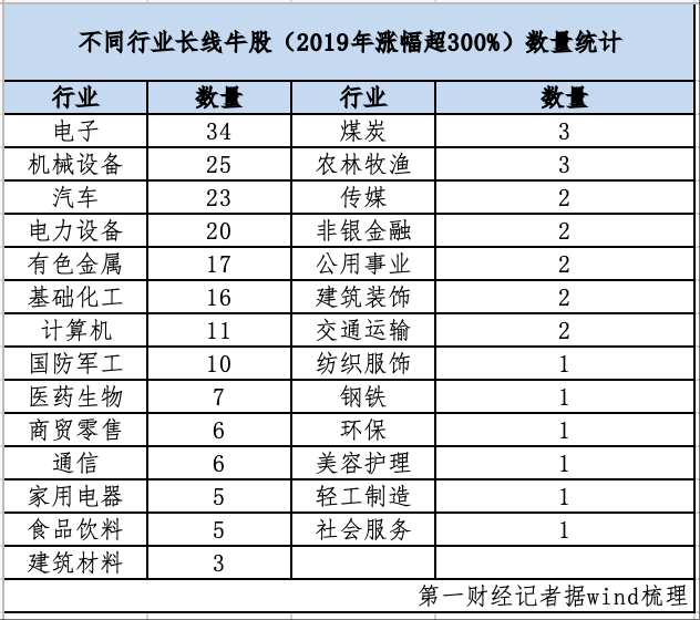 纵观近五年A股市场,电子、电力设备、机械设备、汽车等新兴板块已成为长线牛股的主要发源地。第一财经记者据wind数据统计,2019年底至今共有211只个股涨幅超过300%,是市场中的长线牛股。34只来自电子行业,25只来自机械设备行业,23只来自汽车行业,20只来自电力设备行业。