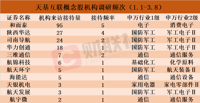 据Choice数据统计,1月以来(1.1-3.8)获机构调研的天基互联概念股包括和而泰、陕西华达、司南导航、华力创通、三维通信、航锦科技、航天环宇、海能达、天银机电、航天发展和航宇微,具体情况如下图: