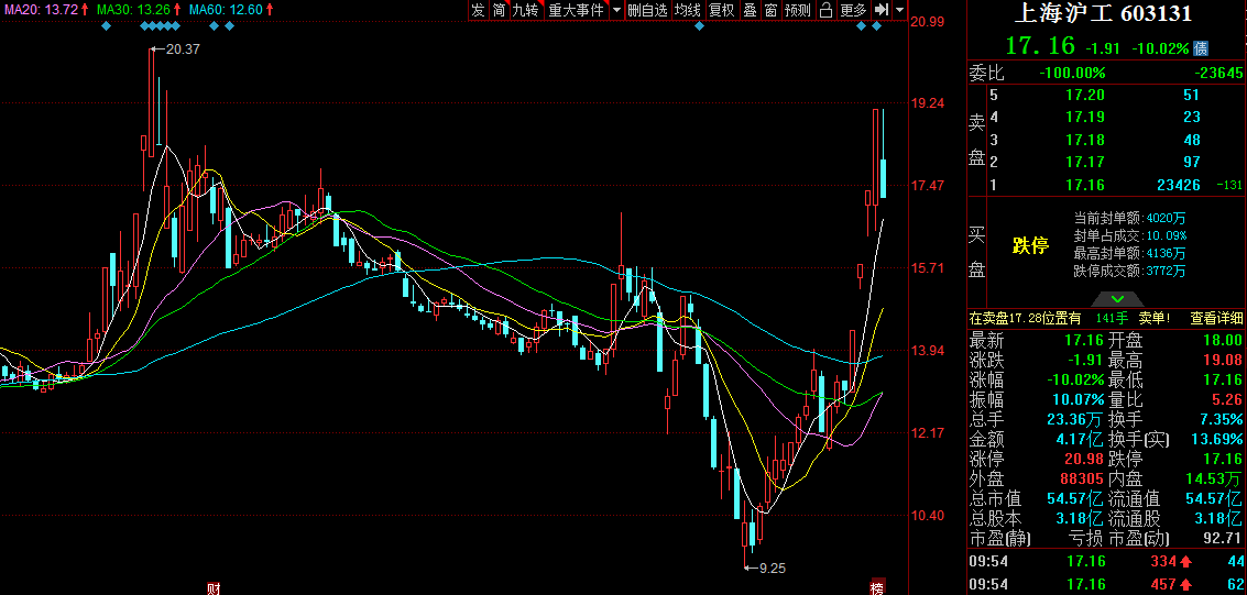 3月11日,上海沪工低开,截至发稿,股价跌停,报17.16元。此前上海沪工走出4连板。