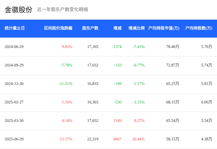 与行业数据对比,截至2025年6月30日,工业金属行业的平均股东数和平均户均持股市值数据暂未公布,但可以推测金徽股份在股东结构上的变化可能与行业整体趋势有一定关联。若行业整体也呈现出股东户数增加、户均持股数减少的趋势,则表明这可能是行业内的普遍现象。